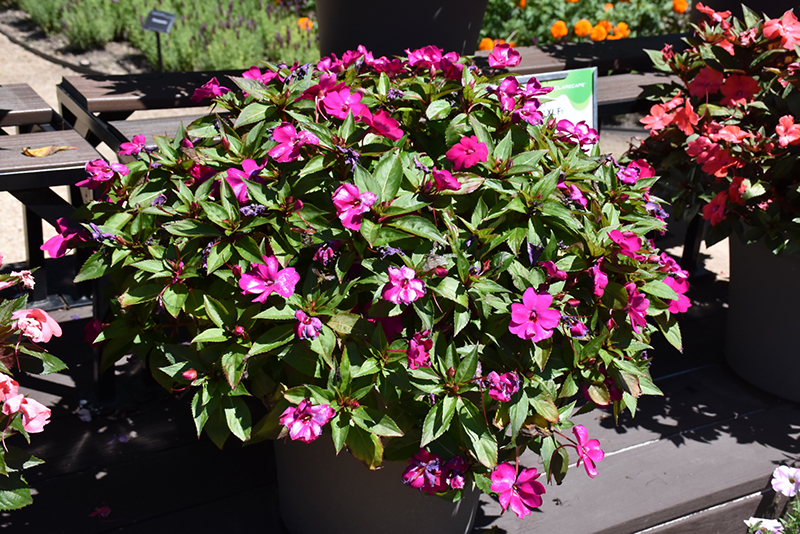 Solarscape™ Neon Purple Impatiens features bold purple round flowers at the ends of the stems from mid spring to early fall. Its pointy leaves remain dark green in colour throughout the season.