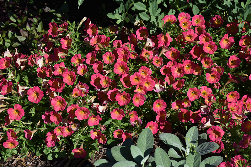 Supertunia® Persimmon Petunia will grow to be about 10 inches tall at maturity, with a spread of 24 inches. When grown in masses or used as a bedding plant, individual plants should be spaced approximately 20 inches apart. Its foliage tends to remain low and dense right to the ground. This fast-growing annual will normally live for one full growing season, needing replacement the following year.