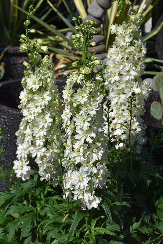 Delgenius® Neva Larkspur features bold spikes of double white flowers with creamy white centers rising above the foliage from early to late summer. The flowers are excellent for cutting. Its deeply cut lobed leaves remain dark green in colour throughout the season.