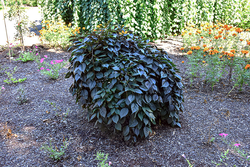 Nightfall® Japanese Snowbell features dainty lightly-scented nodding white bell-shaped flowers with orange anthers hanging below the branches in late spring. It has attractive deep purple-variegated dark green foliage with hints of black. The glossy pointy leaves are highly ornamental and turn outstanding shades of orange and gold in the fall. The fruits are showy gray drupes displayed from late summer to late fall. The smooth khaki (brownish-green) bark adds an interesting dimension to the landscape.