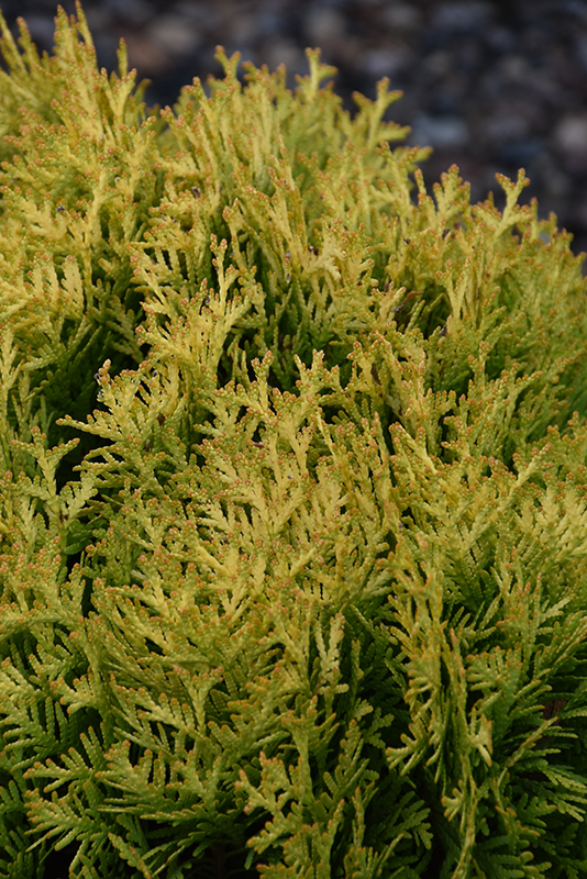 Autumn Moon Arborvitae is a dwarf conifer which is primarily valued in the garden for its ornamental globe-shaped form. It has attractive lime green-variegated gold foliage which emerges yellow in spring. The scale-like sprays of foliage are highly ornamental and turn harvest gold in the fall, which persists throughout the winter.