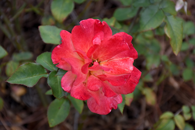 Bengal Tiger Rose features showy clusters of fragrant double orange flowers with scarlet overtones and gold eyes at the ends of the branches from late spring to early fall. The flowers are excellent for cutting. It has green deciduous foliage. The serrated oval compound leaves do not develop any appreciable fall colour.
