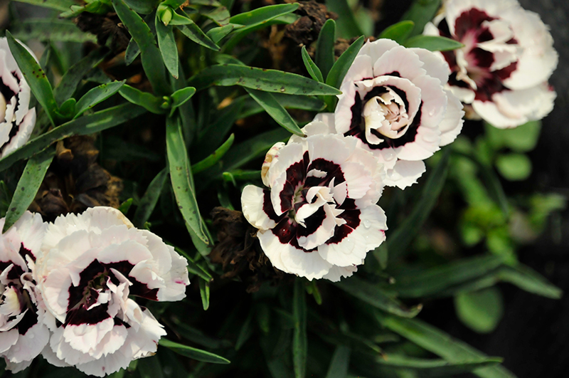Frilly semi-double flowers are white and pale pink with dark red centers, above mounds of fine foliage; fragrant; great for flower arrangements; deadhead to encourage reblooming; pair up with summer blooming perennials; excellent for beds or containers