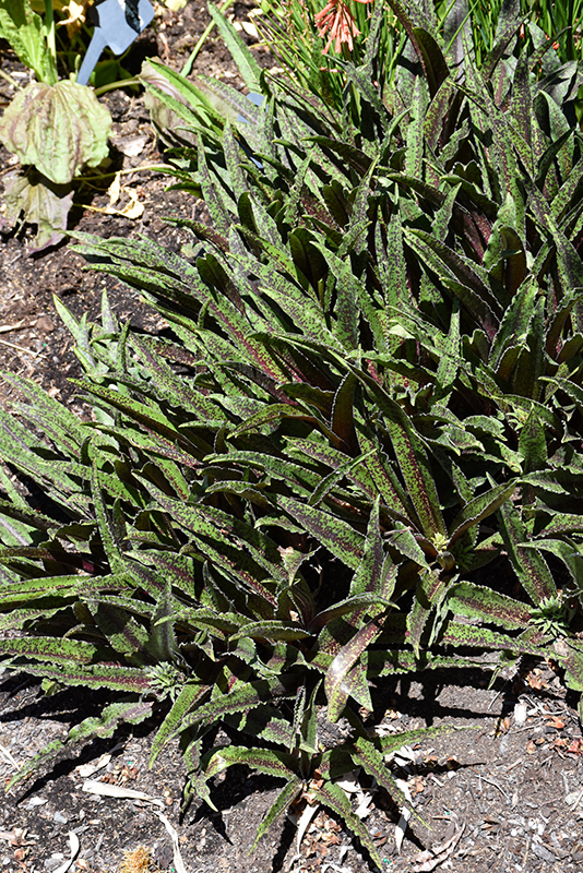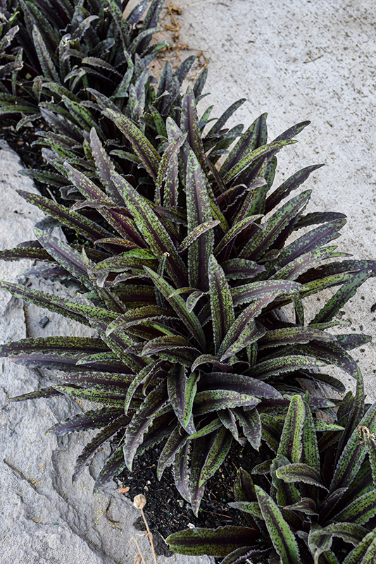 This tropical looking, dwarf selection produces rosettes of green foliage that is heavily speckled in burgundy; short spikes of attractive dark purple flowers rise up in mid to late summer; looks great as a specimen, or in a mass planting