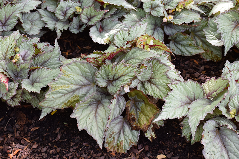 Jurassic Snowfall Begonia's attractive large crinkled heart-shaped leaves emerge grayish green in spring, turning silver in colour with distinctive burgundy veins and tinges of crimson the rest of the year on a plant with an upright spreading habit of growth.