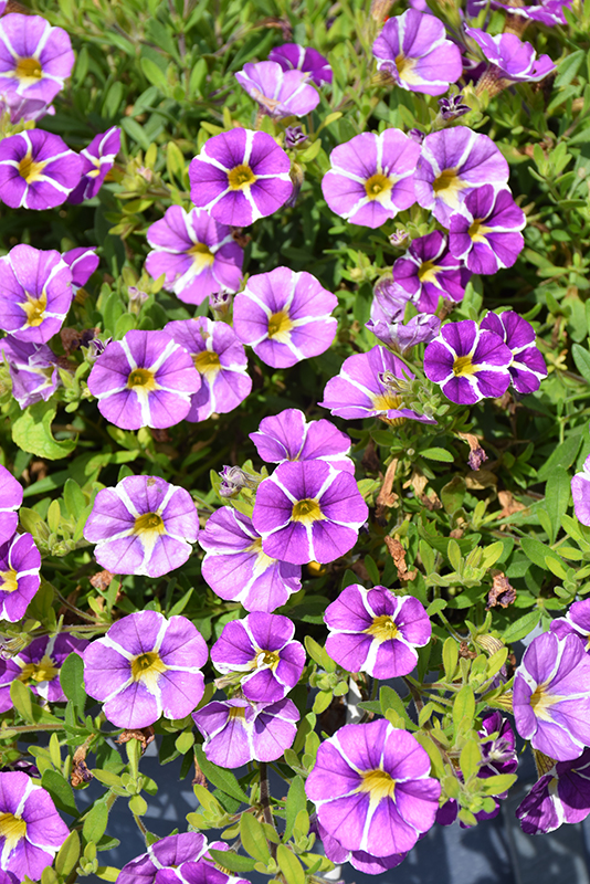 MiniFamous® Uno Blue Star Calibrachoa is draped in stunning violet trumpet-shaped flowers with blue overtones, yellow throats and white stripes at the ends of the stems from late spring to early fall. Its small pointy leaves remain green in colour throughout the season.