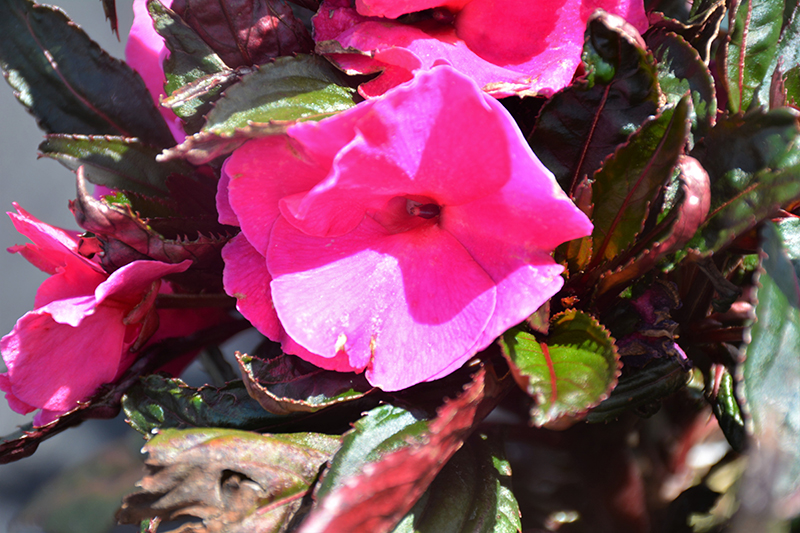 MegaGuinea Purple New Guinea Impatiens features bold fuchsia round flowers with purple overtones at the ends of the stems from mid spring to early fall. Its attractive pointy leaves emerge light green in spring, turning dark green in colour with distinctive red veins and tinges of burgundy throughout the season.