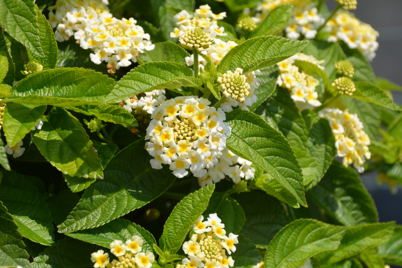 Gem™ Pearl Lantana features showy cymes of white flowers with buttery yellow overtones and lemon yellow eyes at the ends of the branches from early summer to mid fall. Its pointy leaves remain green in colour throughout the year.