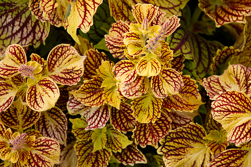 Main Street Venice Boulevard™ Coleus' attractive serrated oval leaves remain lime green in colour with distinctive burgundy veins and tinges of gold throughout the season on a plant with an upright spreading habit of growth.