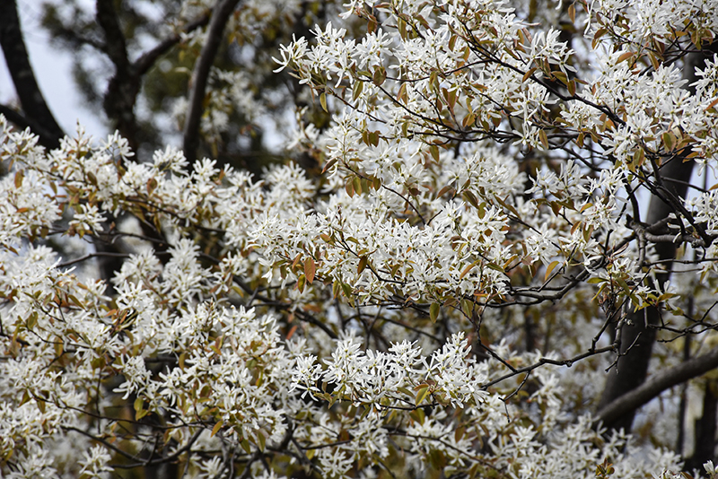 Allegheny Serviceberry is blanketed in stunning clusters of white flowers rising above the foliage in early spring before the leaves. It has dark green deciduous foliage. The oval leaves turn an outstanding orange in the fall. It produces blue berries in late spring.