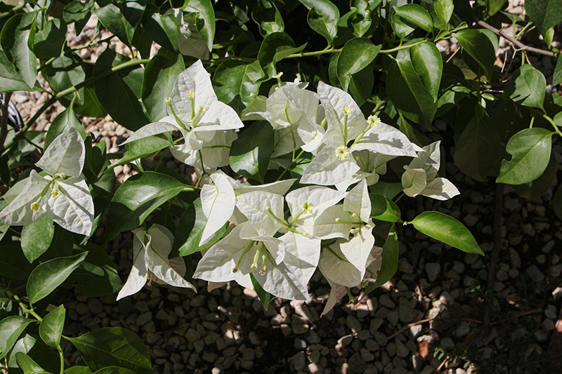 Mauna Kea Bougainvillea is clothed in stunning white flowers with white bracts held atop the branches from late spring to mid fall. Its glossy pointy leaves remain dark green in colour throughout the year.