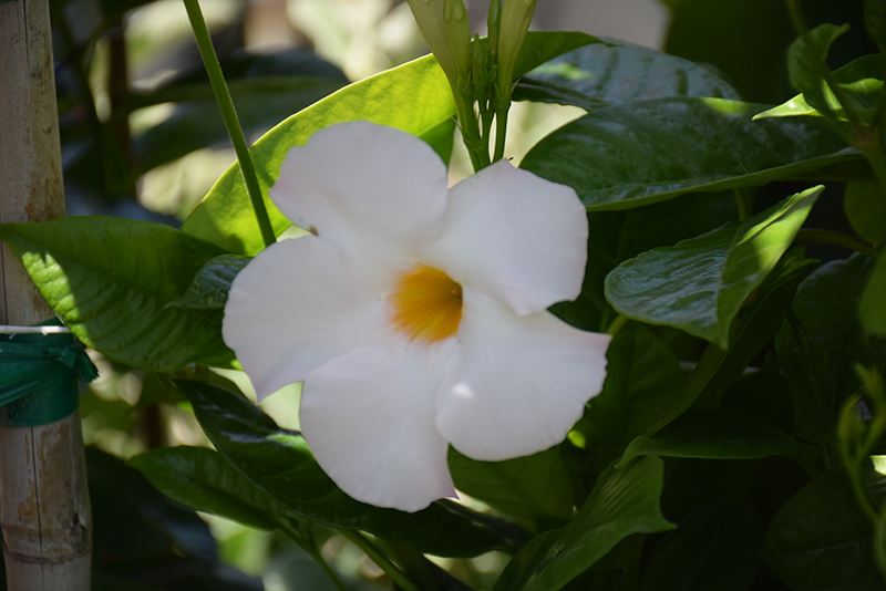 Tropical Breeze™ White Mandevilla features bold white tubular flowers with yellow throats along the branches from mid spring to mid fall. Its glossy pointy leaves remain dark green in colour throughout the year.