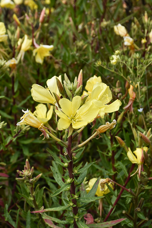 Common Evening Primrose has masses of beautiful clusters of lightly-scented yellow cup-shaped flowers at the ends of the stems from late spring to late summer, which emerge from distinctive rose flower buds, and which are most effective when planted in groupings. Its pointy leaves remain olive green in colour throughout the season. The burgundy stems can be quite attractive.