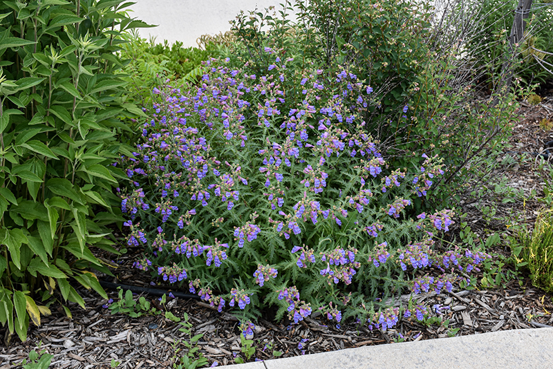 An outstanding penstemon, presenting gorgeous rose and violet-blue flowers rising above gray-green foliage; makes a beautiful visual impact when massed in the garden, along walkways, or in borders; forms shrub-like mounds over time