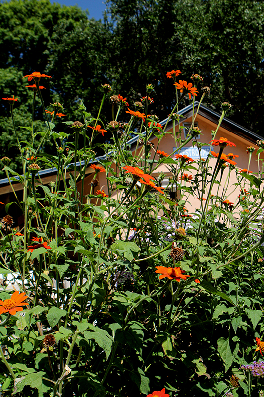 Mexican Sunflower will grow to be about 6 feet tall at maturity, with a spread of 6 feet. It tends to be leggy, with a typical clearance of 1 foot from the ground, and should be underplanted with lower-growing perennials. Although it's not a true annual, this fast-growing plant can be expected to behave as an annual in our climate if left outdoors over the winter, usually needing replacement the following year. As such, gardeners should take into consideration that it will perform differently than it would in its native habitat.