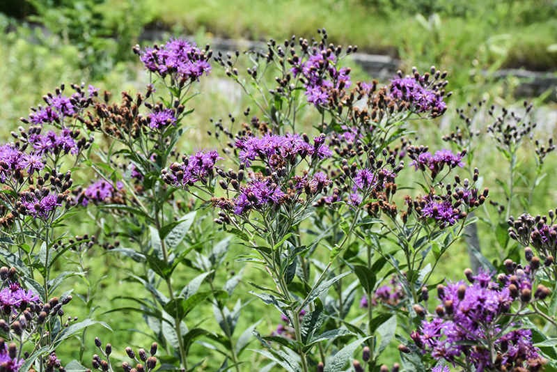 Prairie Ironweed will grow to be about 4 feet tall at maturity, with a spread of 4 feet. When grown in masses or used as a bedding plant, individual plants should be spaced approximately 3 feet apart. Its foliage tends to remain dense right to the ground, not requiring facer plants in front. It grows at a fast rate, and under ideal conditions can be expected to live for approximately 10 years. As an herbaceous perennial, this plant will usually die back to the crown each winter, and will regrow from the base each spring. Be careful not to disturb the crown in late winter when it may not be readily seen!
