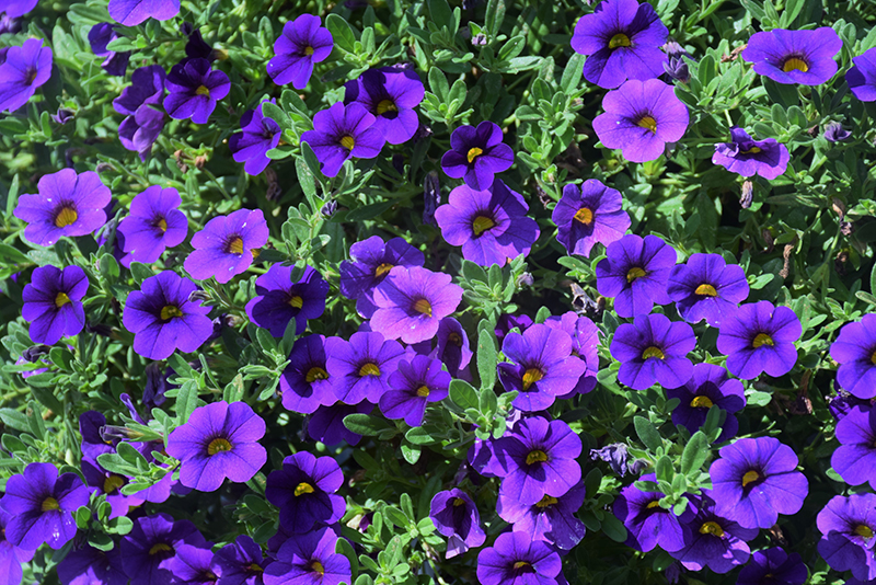 Cabaret® Midnight Blue Calibrachoa will grow to be about 10 inches tall at maturity, with a spread of 12 inches. When grown in masses or used as a bedding plant, individual plants should be spaced approximately 12 inches apart. Its foliage tends to remain low and dense right to the ground. This fast-growing annual will normally live for one full growing season, needing replacement the following year.