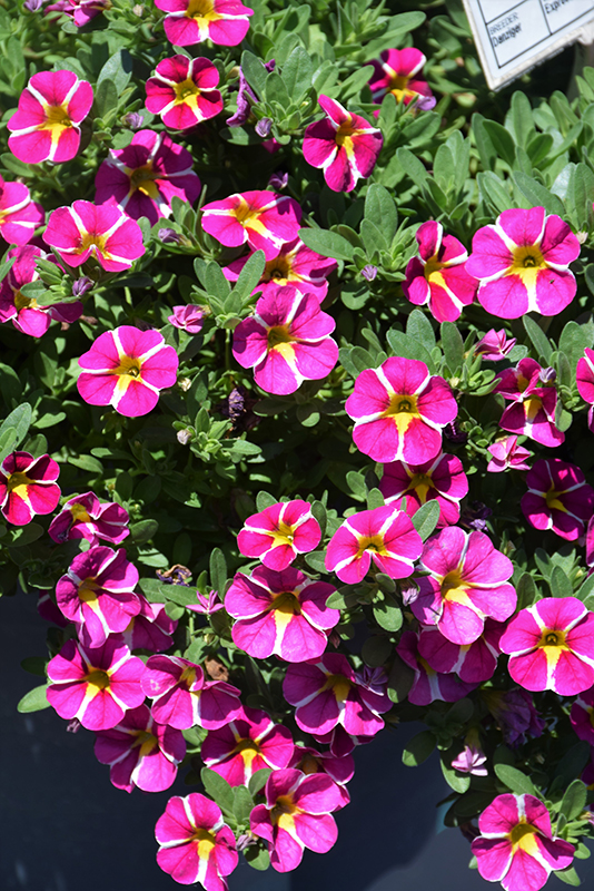 Colibri™ Pink Bling Calibrachoa is draped in stunning pink trumpet-shaped flowers with yellow throats and yellow streaks at the ends of the stems from early spring to mid fall. Its small pointy leaves remain green in colour throughout the season.