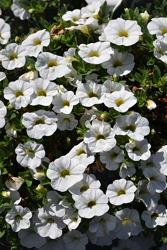 Colibri™ Pure White Calibrachoa is blanketed in stunning white trumpet-shaped flowers with yellow throats at the ends of the stems from early spring to mid fall. Its small pointy leaves remain green in colour throughout the season.