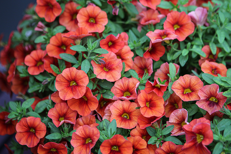 Colibri™ Tangerine Calibrachoa is covered in stunning orange trumpet-shaped flowers with scarlet centers at the ends of the stems from early spring to mid fall. Its small pointy leaves remain green in colour throughout the season.
