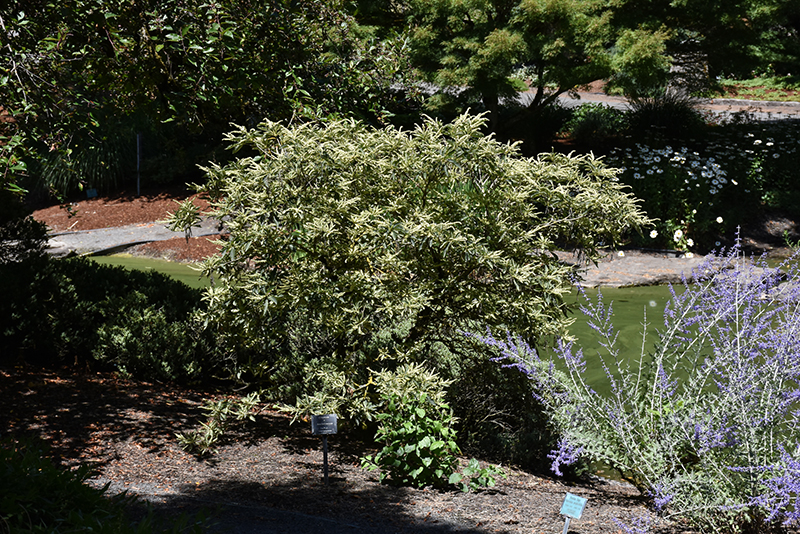 This highly fragrant large shrub or small tree features spikes of sweetly scented white flowers in summer, over green and white variegated leaves that emerge with hints of salmon pink; upright habit of growth; needs rich, moisture retentive soil