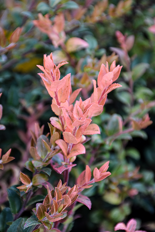 A distinctive shrub with vivid coral new leaves, maturing to green with cream variegation; pale pink, urn-shaped flowers in spring produce purple-black berries in summer; upright, bushy growth habit; needs acidic, well drained soil, plant with peat moss