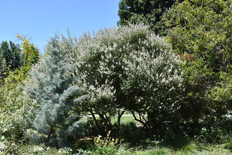 An uncommon garden shrub featuring narrow, airy spikes of white flowers in late summer to early autumn; distinctively palmate-leaves; can be treated like a perennial and cut back each spring, as it flowers on new wood and regrows vigorously