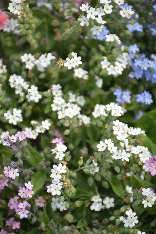 Mon Amie White Forget-Me-Not will grow to be about 8 inches tall at maturity, with a spread of 8 inches. When grown in masses or used as a bedding plant, individual plants should be spaced approximately 6 inches apart. It grows at a fast rate, and tends to be biennial, meaning that it puts on vegetative growth the first year, flowers the second, and then dies. However, this species tends to self-seed and will thereby endure for years in the garden if allowed. As an herbaceous perennial, this plant will usually die back to the crown each winter, and will regrow from the base each spring. Be careful not to disturb the crown in late winter when it may not be readily seen!