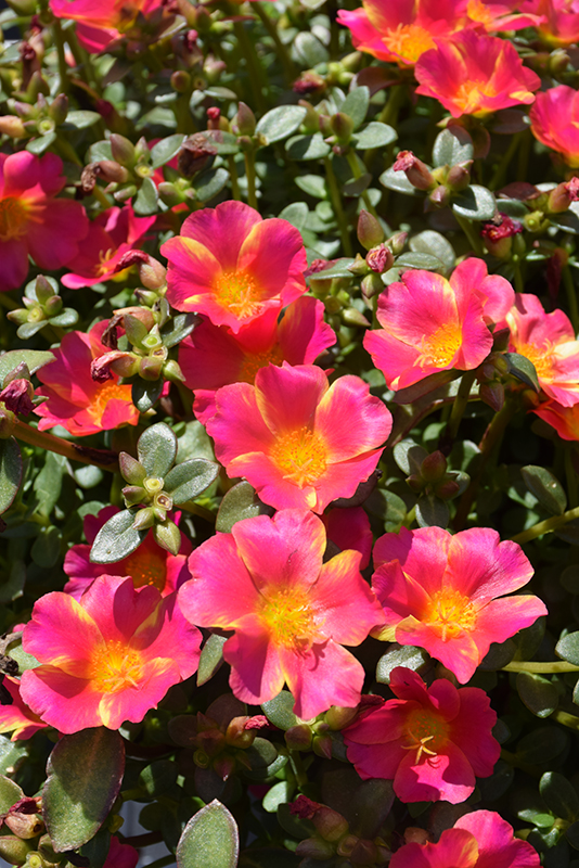 Mega Pazzaz™ Pink Twist Portulaca features showy pink cup-shaped flowers with yellow eyes and yellow streaks at the ends of the stems from late spring to early fall. Its tiny succulent oval leaves remain green in colour throughout the season.