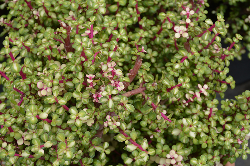 An upright, slow growing plant with interesting pinkish-red stems, and tiny succulent green leaves with wide cream middle stripes; popular use in bonsai; very drought tolerant and great for rock gardens or containers