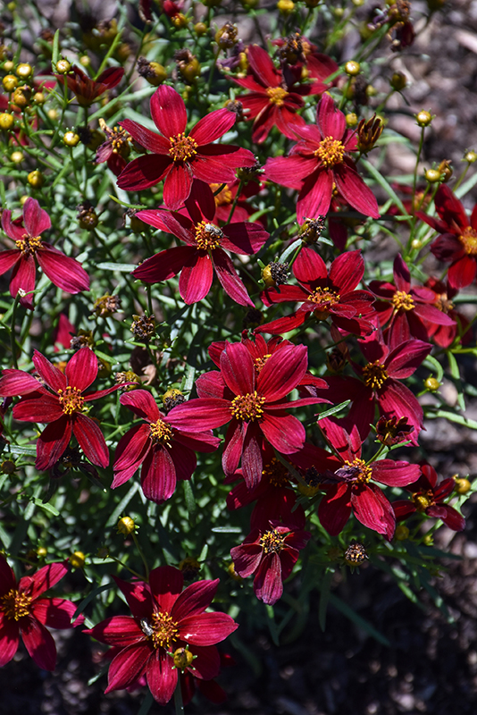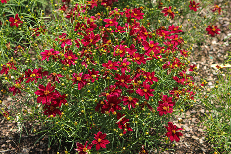 Designer Threads™ Scarlet Ribbons Tickseed will grow to be about 16 inches tall at maturity, with a spread of 20 inches. Its foliage tends to remain dense right to the ground, not requiring facer plants in front. It grows at a medium rate, and under ideal conditions can be expected to live for approximately 15 years. As an herbaceous perennial, this plant will usually die back to the crown each winter, and will regrow from the base each spring. Be careful not to disturb the crown in late winter when it may not be readily seen!