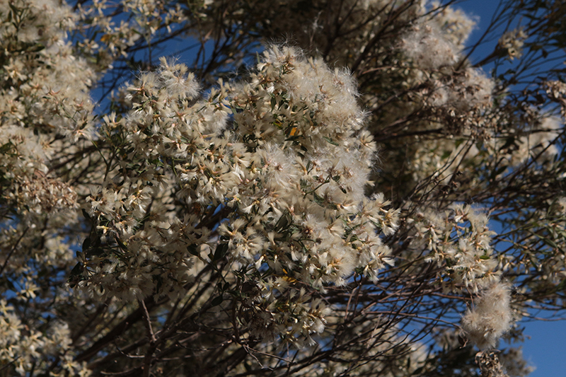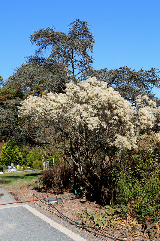 Blooming in fall, this medium to large, semi-evergreen shrub produces white fluffy female, and inconspicuous male flowers on separate plants; seeds spread by wind, so undesirable spread could occur; salt tolerant, and can be used on wet or dry sites
