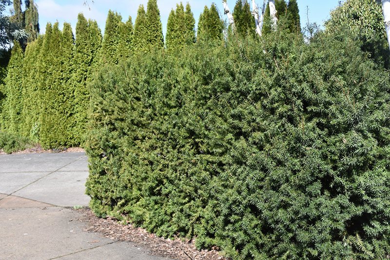 Kobes Hicksii Japanese Yew will grow to be about 9 feet tall at maturity, with a spread of 11 feet. It has a low canopy, and is suitable for planting under power lines. It grows at a slow rate, and under ideal conditions can be expected to live for 70 years or more.