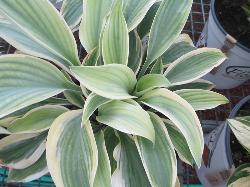 A large hosta variety featuring long pointed, blue-green foliage with creamy-yellow margins; an upright vase-shaped mound provides beautiful texture and contrast to other plants; lavender flowers on tall spikes in mid to late summer
