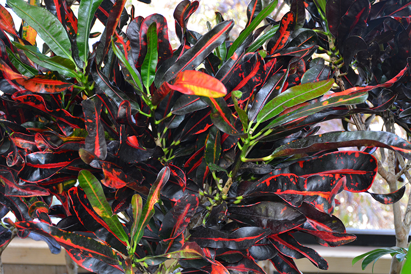 This woody perennial is considered as a houseplant in colder climates, noted for its striking foliage but, can be grown outdoors in warmer areas; glossy lanceolate leaves in a bright range of colors, from light green to burgundy red