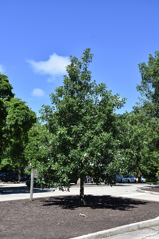 Schuette's Oak has dark green deciduous foliage on a tree with a pyramidal habit of growth. The glossy lobed leaves turn coppery-bronze in fall. However, the fruit can be messy in the landscape and may require occasional clean-up.