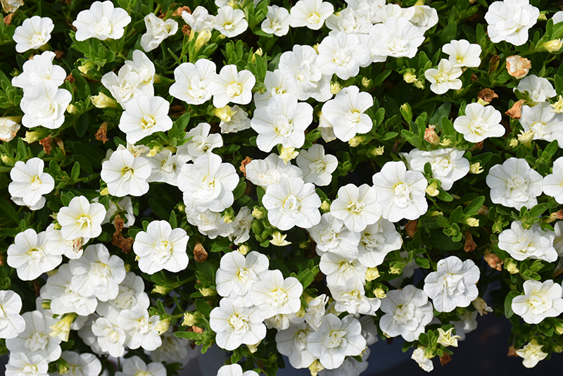 Aloha Double White Calibrachoa is blanketed in stunning double white trumpet-shaped flowers at the ends of the stems from late spring to early fall. Its small pointy leaves remain green in colour throughout the season.