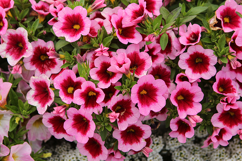 Aloha Kona Hula Pink Calibrachoa is clothed in stunning pink trumpet-shaped flowers with yellow throats and scarlet centers at the ends of the stems from late spring to early fall. Its small pointy leaves remain green in colour throughout the season.