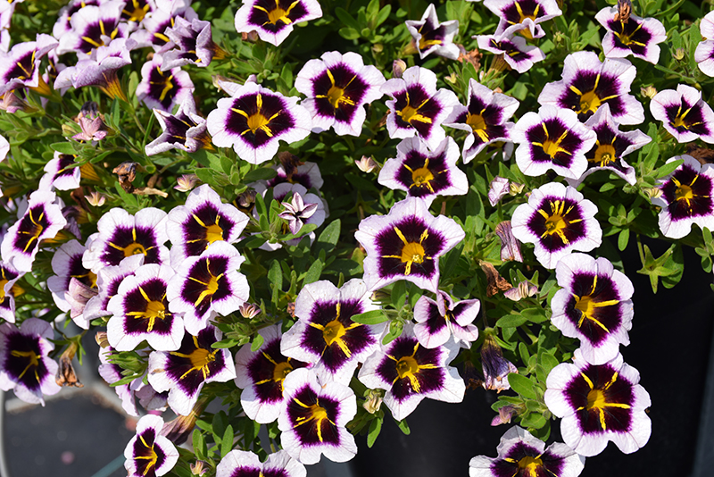 Calitastic® Bordeaux Star Calibrachoa is covered in stunning lavender trumpet-shaped flowers with deep purple overtones, yellow throats and yellow stripes at the ends of the stems from late spring to early fall. Its small pointy leaves remain green in colour throughout the season.