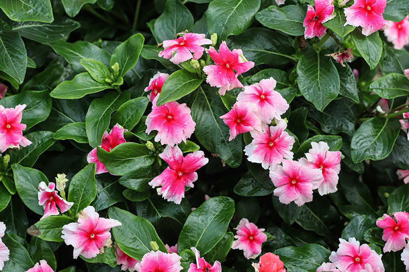 Soiree® Flamenco Strawberry Picotee Vinca will grow to be about 8 inches tall at maturity extending to 12 inches tall with the flowers, with a spread of 16 inches. Its foliage tends to remain low and dense right to the ground. Although it's not a true annual, this fast-growing plant can be expected to behave as an annual in our climate if left outdoors over the winter, usually needing replacement the following year. As such, gardeners should take into consideration that it will perform differently than it would in its native habitat.