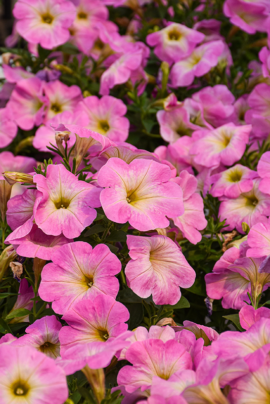 Potunia® Plus Baby Pink Petunia is smothered in stunning pink trumpet-shaped flowers with yellow throats and white centers at the ends of the stems from mid spring to late summer. Its pointy leaves remain green in colour throughout the season.