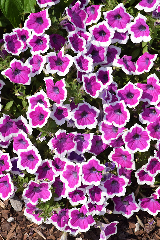 Supertunia® Hoopla® Vivid Orchid™ Petunia is smothered in stunning fuchsia trumpet-shaped flowers with purple throats and white edges at the ends of the stems from mid spring to mid fall. Its pointy leaves remain green in colour throughout the season.