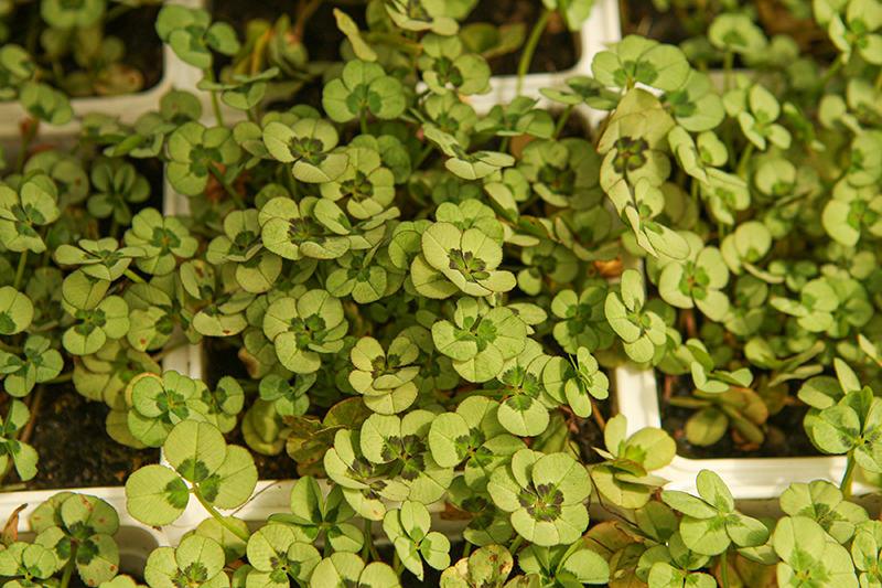 An ornamental 4 leaf clover with leaves that are bright, light green with contrasting dark centers; the roots of this plant fix nitrogen in the soil; perfect for cascading over walls or containers; spreads quickly, potentially invasive