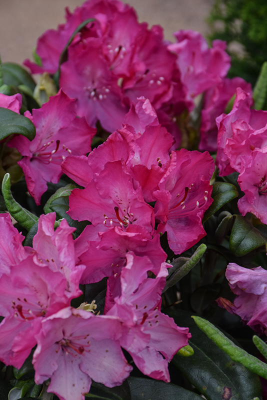 A relatively new broadleaf evergreen shrub featuring sumptuous dark red flowers in spring, coarse dark foliage and a dense mounded habit, quite hardy; absolutely must have well-drained, highly acidic and organic soil, use plenty of peat moss when planting