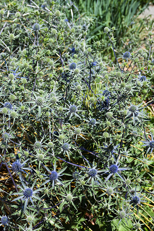 Blue Cap Sea Holly will grow to be about 24 inches tall at maturity extending to 3 feet tall with the flowers, with a spread of 18 inches. When grown in masses or used as a bedding plant, individual plants should be spaced approximately 15 inches apart. It tends to be leggy, with a typical clearance of 1 foot from the ground, and should be underplanted with lower-growing perennials. It grows at a fast rate, and under ideal conditions can be expected to live for approximately 10 years. As an herbaceous perennial, this plant will usually die back to the crown each winter, and will regrow from the base each spring. Be careful not to disturb the crown in late winter when it may not be readily seen!