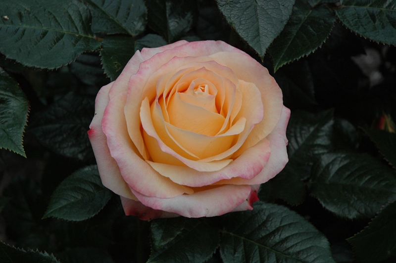 The Day Breaker Rose is covered in stunning lightly-scented double peach flowers with orange overtones and pink tips at the ends of the branches from late spring to early fall. The flowers are excellent for cutting. It has dark green deciduous foliage. The glossy oval compound leaves do not develop any appreciable fall colour. The fruits are showy red hips displayed in late fall.