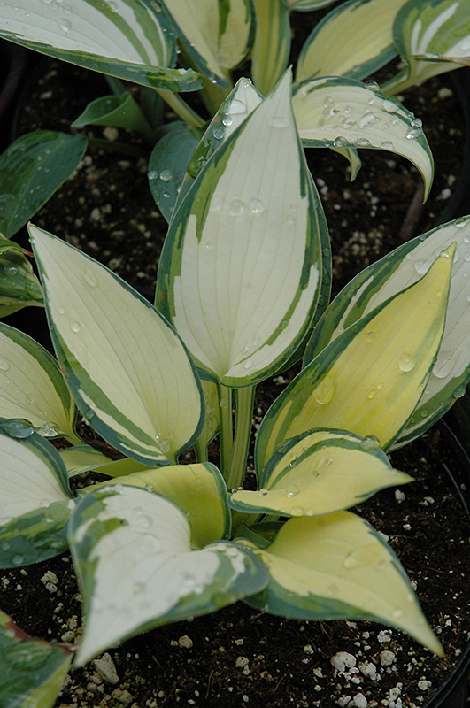 Remember Me Hosta features dainty spikes of lavender tubular flowers rising above the foliage in mid summer. Its attractive small textured pointy leaves remain creamy white in colour with showy bluish-green variegation and tinges of green throughout the season.