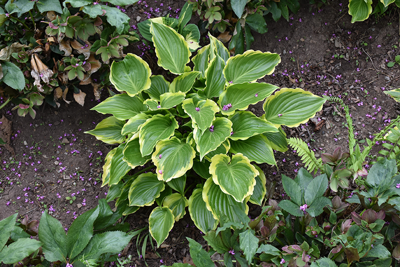 Sugar And Spice Hosta will grow to be about 10 inches tall at maturity extending to 18 inches tall with the flowers, with a spread of 3 feet. When grown in masses or used as a bedding plant, individual plants should be spaced approximately 30 inches apart. Its foliage tends to remain low and dense right to the ground. It grows at a medium rate, and under ideal conditions can be expected to live for approximately 10 years. As an herbaceous perennial, this plant will usually die back to the crown each winter, and will regrow from the base each spring. Be careful not to disturb the crown in late winter when it may not be readily seen!