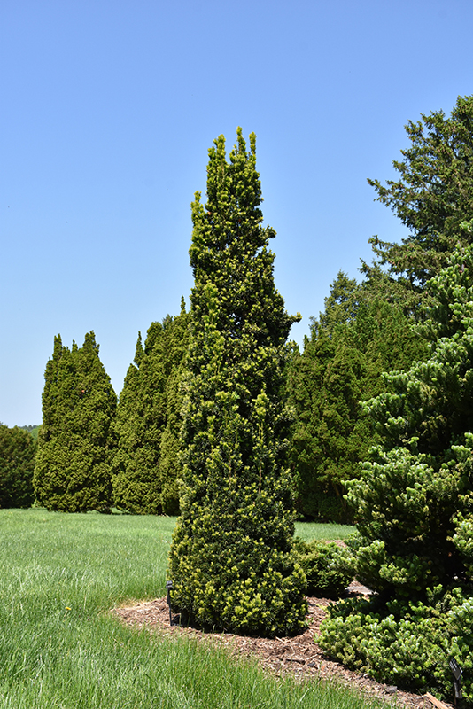 An extremely narrow and columnar evergreen shrub with sea-green needles which emerge yellow-green in spring; makes a great tall feature accent plant for articulation in the garden, takes pruning very well, does well in shade