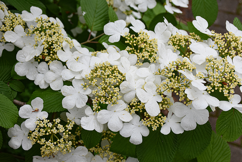 Shoshoni Doublefile Viburnum is clothed in stunning white lacecap flowers held atop the branches in mid spring. The red fruits are held in abundance in spectacular clusters from mid summer to early fall. It has dark green deciduous foliage. The serrated pointy leaves turn an outstanding brick red in the fall.